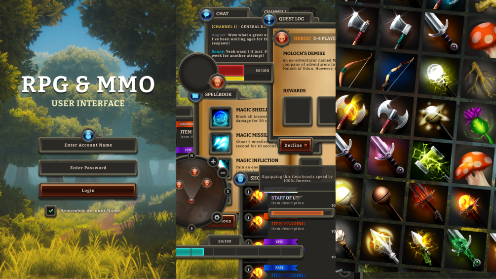 Hey guys! Welcome to this new RPG and MMO User Interface kit that has been built from scratch in Figma. This compliments my Photoshop version of this RPG and MMO User Interface asset kit. This kit also includes over 100 hand painted icons to get you started with your project.